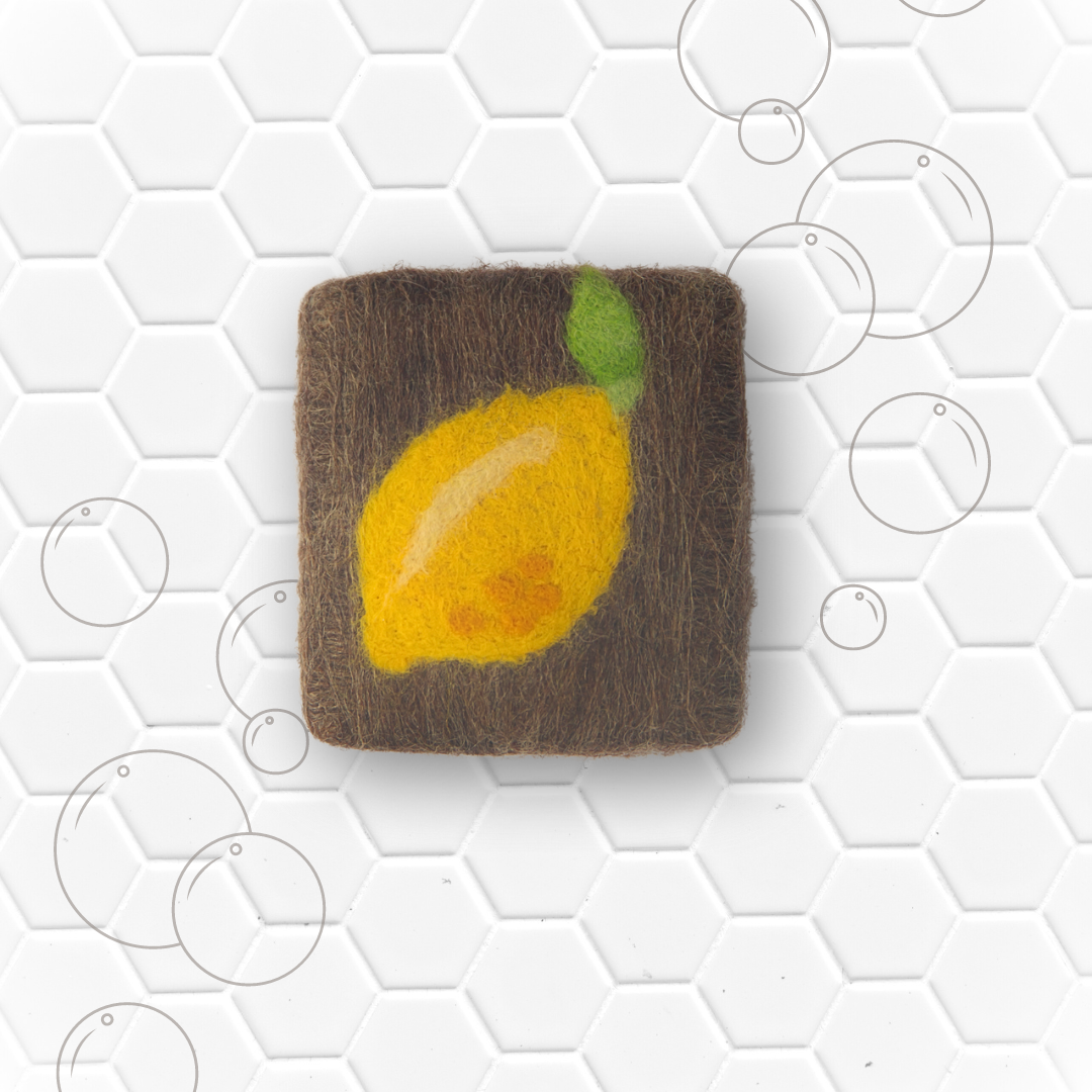 specially formulated for tough grease and grime! Just get it wet and go! The felting adds surface safe scrubbing power – great for non-stick pans, stainless sinks and natural material countertops! The continuous release of soap and the shape of the bar keeps hands a little further away from the greasy grime and there is no need to fill the sink when washing dishes. Just add water to the pot, pan or dish and scrub. Then rinse. You are done!